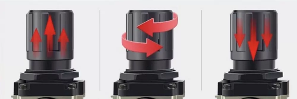 Sul tappo di regolazione è presente una scala di pressione. Quando viene fornita aria, sollevare la manopola e ruotarla in senso orario verso il segno "+" per aumentare la pressione. Dopo la regolazione, premere la manopola verso il basso per bloccarla.