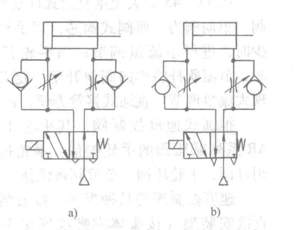 Lo schema mostra 2 modi per collegare una valvola di controllo della velocità in un circuito pneumatico.