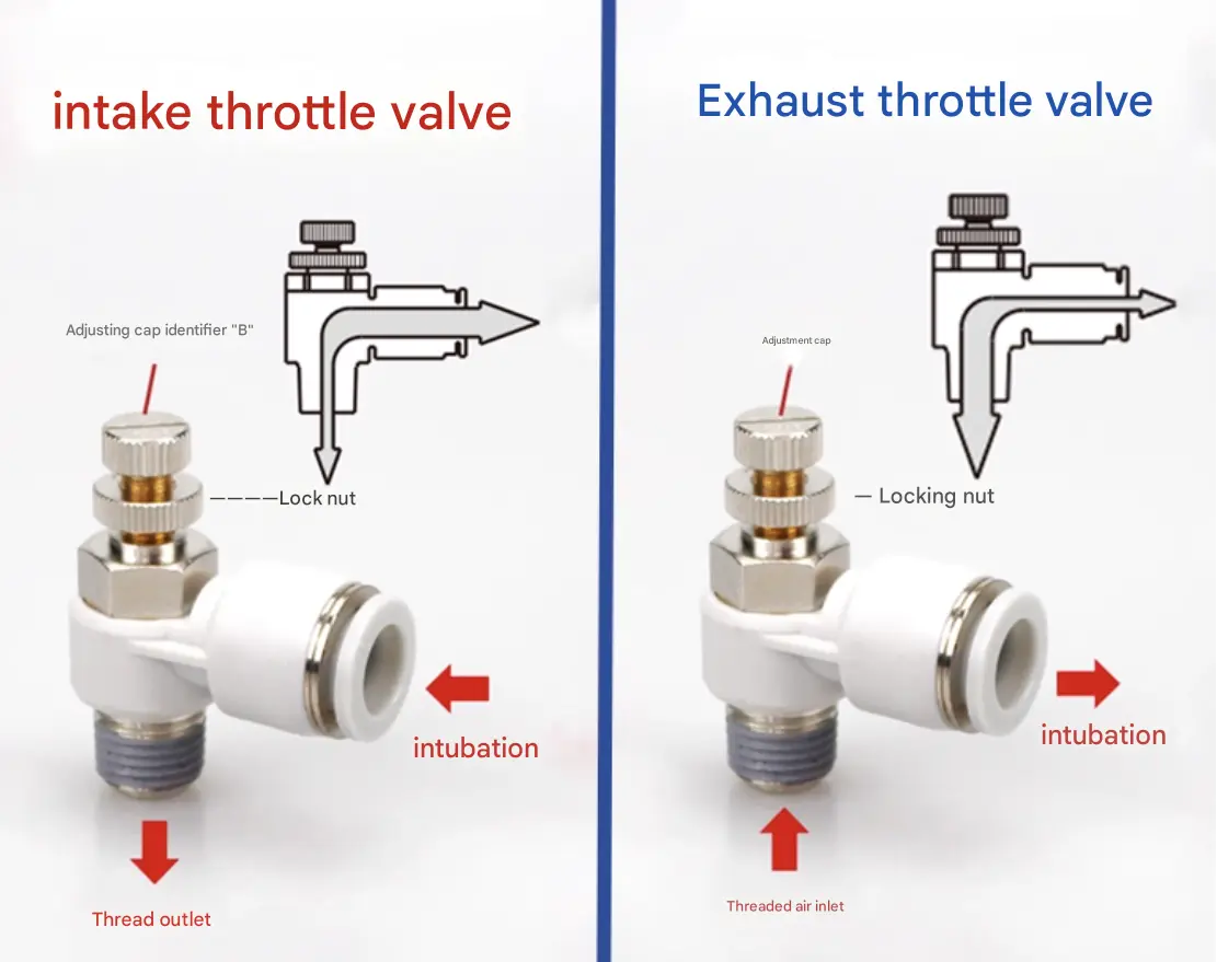 Si tratta di valvole a farfalla di aspirazione e scarico, contraddistinte dalle marcature sul cappuccio "B" e "OUT". Possono essere utilizzati insieme: la valvola a farfalla di aspirazione regola il flusso di alimentazione dell'aria, mentre la valvola a farfalla di scarico controlla la velocità del cilindro per un controllo più preciso del sistema.