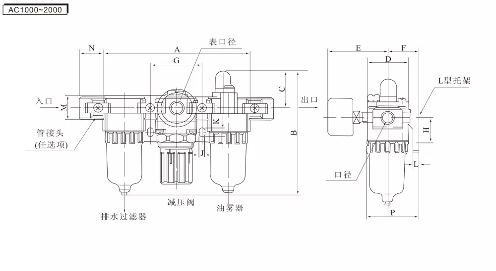 AF (filtro dell'aria) + AR (valvola di regolazione della pressione) + AL (lubrificatore a nebbia d'olio) = unità tripla AC