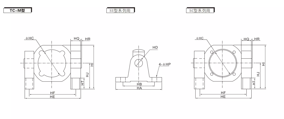 Rispetto alla staffa TCTC-M, la staffa di montaggio TC-M ha due basi di montaggio aggiuntive e la struttura della staffa TC-M è più robusta, adatta per applicazioni con frequenza operativa ad alta cilindro o alta forza trainante.